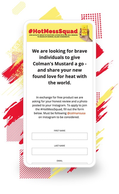 Brand ambassador programs are UGC gold mines, and Colman’s Mustard created a smart ambassador campaign with a twist. To be considered for their brand ambassador program, folks must submit their personal information (name, email, physical address) and Colman’s Mustard will send them a free sample. In return for the sample, entrants need to post a product review and a photo on Instagram with the hashtag #HotMessSquad.