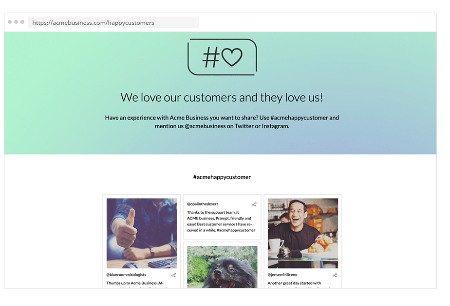 Every business can benefit from customer feedback in the form of a review - but reviews can sometimes be tough to get. Large brands shell out beaucoup bucks to companies who host review-capturing campaigns. Keep your money in your pocket! This template makes it simple to collect and display reviews by asking customers to use a hashtag you designate for this purpose.Similar to using the giveaway and contest templates previously mentioned, the hashtagged reviews will be pulled into a feed and displayed right on your campaign. You can then promote the published landing page on social media, or embed it right on your website.