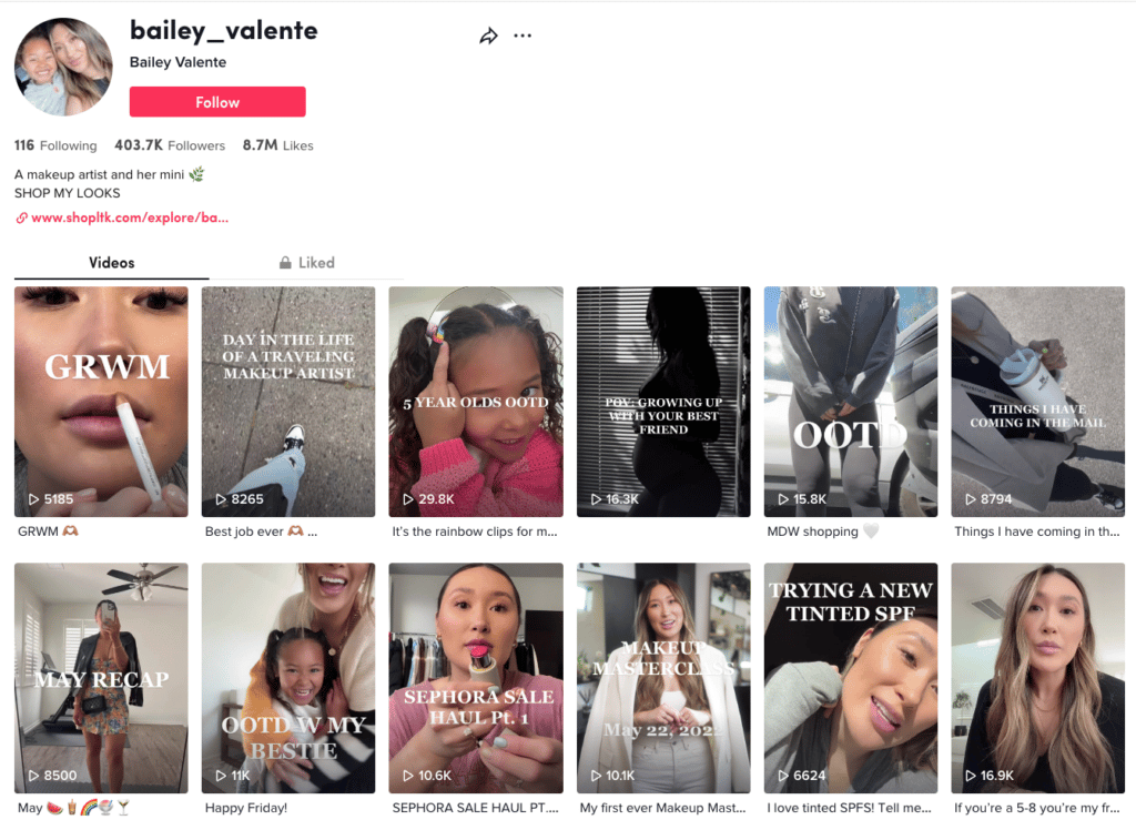 To get a better idea of what to consider when choosing an influencer, I asked Bailey Valente: Tiktok: @bailey_valente Instagram: @baileyvalente. Bailey is a beauty influencer based in Reno, NV whose make-up tutorials, OOTDs and hauls, and adorable personal content (her daughter Cruz regularly shows up on her TikTok) have earned her quite the following.