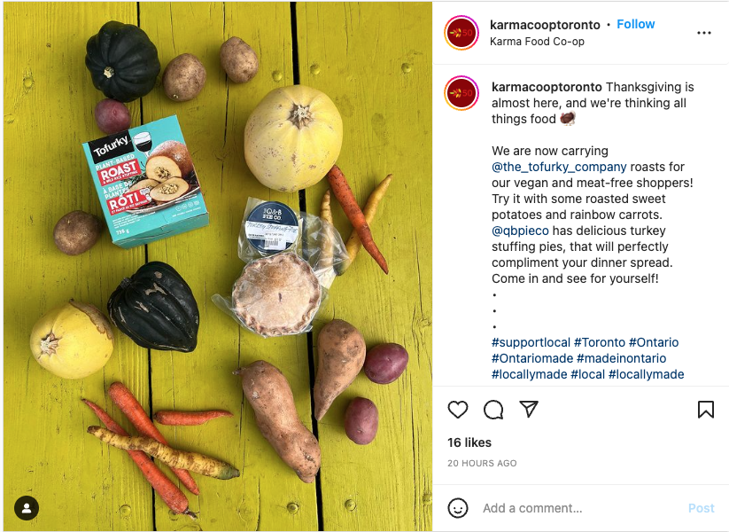 For example, you could run a content marketing campaign on social media with professionally shot videos and photos that place your product or service alongside a Thanksgiving Day’s feast. Obviously, this is easier if you sell food products, like this small food co-op below: