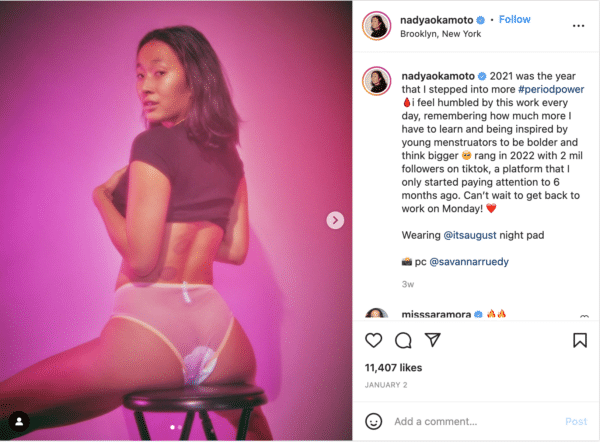 #periodpower post by CEO of August, Nadya Okamoto[/caption]Okamoto uses social media to educate her followers on how to use period products and what menstruating actually looks like (no more classic blue-dyed water other brands use in their ads). Okamoto is also very candid about how her body looks. As seen in her Instagram (@nadyaokamoto) post above, she has marks from a cupping procedure, her hair is undone and she is wearing a pad. By being transparent to her followers, she is gaining their trust and, ultimately, their business.