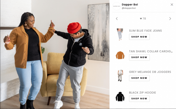 Dapper Boi Clothing Company[/caption]Dapper Boi’s candid dancing photo is another great example of showing a brand’s true self. They showcase two unique individuals wearing the brand’s clothing while dancing. The clothing items they are wearing populates on the side. It’s easy to see that their clothing is comfortable for dancing with friends!
