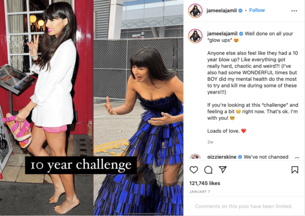 Jameela Jamil is a fantastic actress and celebrity, most famous for her role as Tahani in “The Good Place.” While she doesn’t have a clothing brand or product line, she’s leading a crusade for “real” images in the media by advocating for feminism, mental health and body positivity. True to her cause, she uses her social media presence to show her true self. She posts selfies of her grey hair and rants about eating disorders. One notable Instagram post is showing her 10-year “blow up” (instead of her glow-up), and points out to her followers that they are not alone if these past 10 years have been blah.[caption id="attachment_48948" align="alignnone" width="600"]