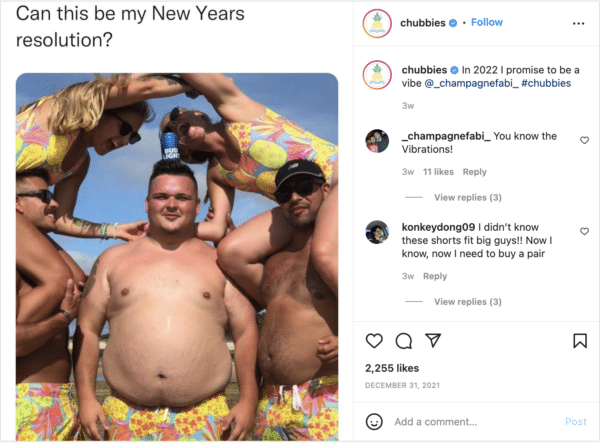 Chubbies is a fun weekend-style clothing brand for men. While it can be very hard to find men’s clothing brands that cater to different body types, Chubbies has taken the challenge. Their clothing is made to be stylish while fitting men with real bodies – not just models with ripped abs. They recently posted this great “new years resolution” on their Instagram (@chubbies):