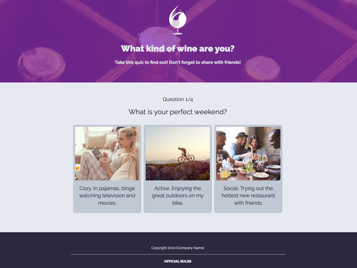 In this personality quiz example, answer the questions to find out what type of wine you are. Try it out!