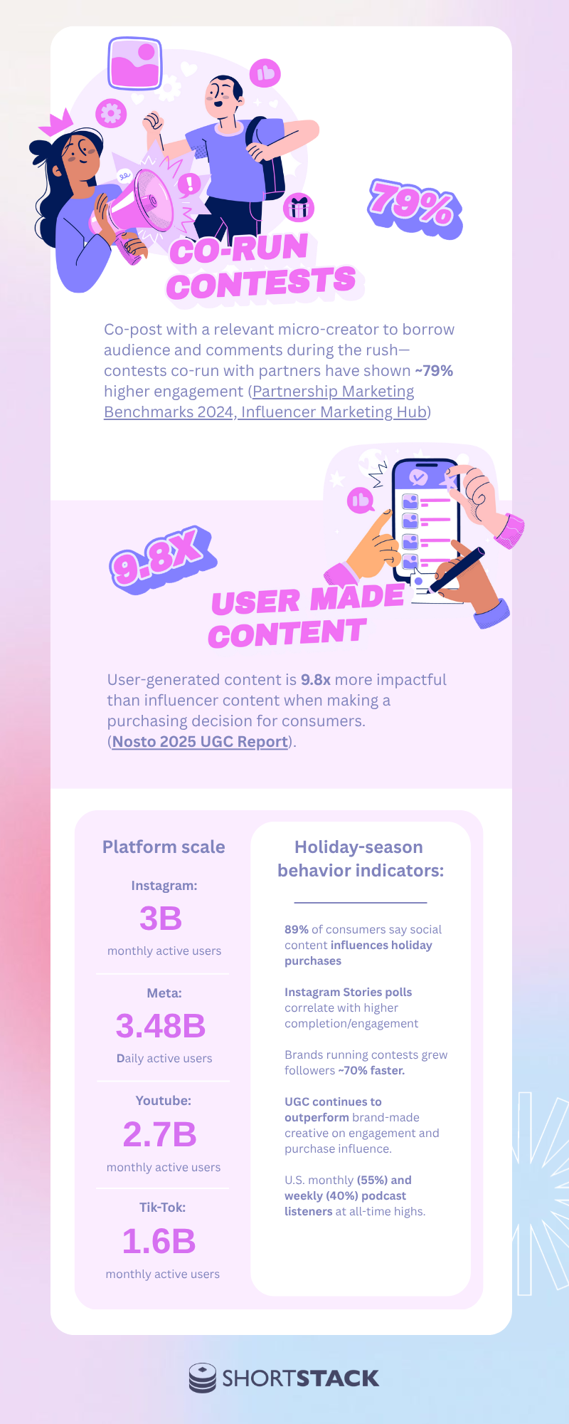 Social usage is heavy in Q4, but day-by-day patterns wobble around major holidays. Historical glimpses show holiday days can become record engagement moments (e.g., Thanksgiving once set Instagram traffic records in 2012), but they also compress attention into shorter windows. Focus on formats designed for microinteractions (polls, sliders, quick comments) and frictionless viewing (UGC reels, podcast clips).