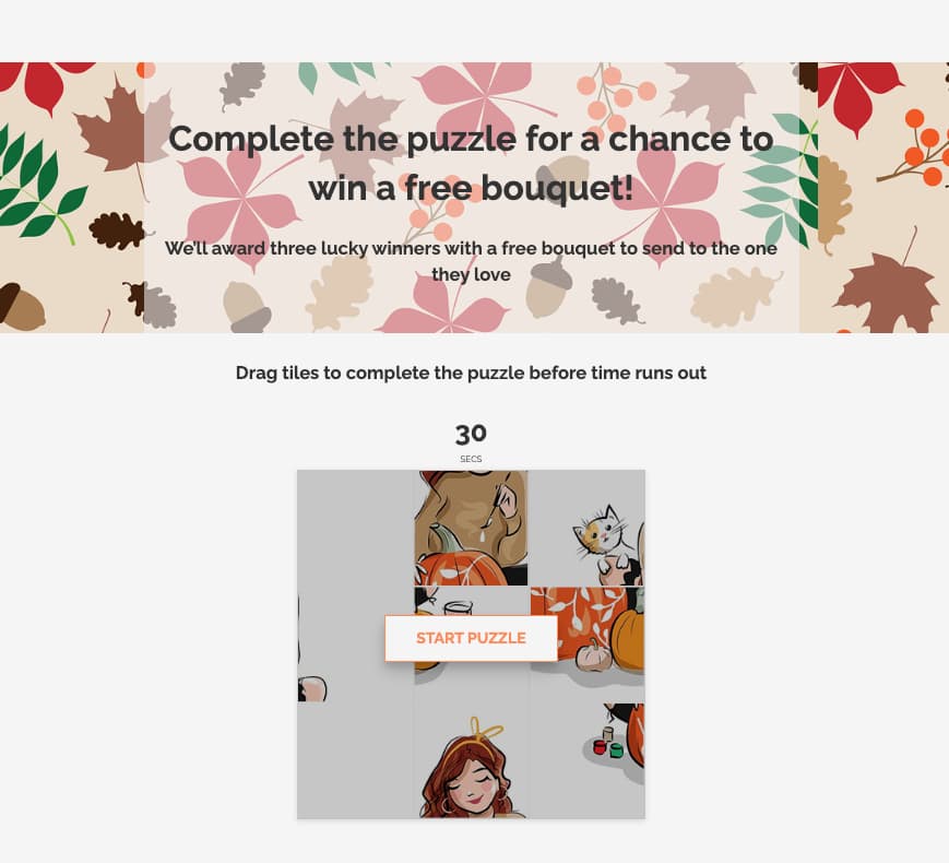 Another option is this puzzle game. The puzzle can be created using any image. Participants can compete for the best time or simply complete the puzzle for a chance to enter a giveaway. Either way, this gamified approach can become a seasonal tradition for your brand.
