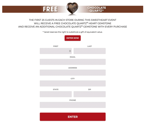 Their event landing page included a giveaway for a $4,999 shopping spree during a Le Vian show at Jared. In addition to the chance to win the shopping spree, contest entrants were given a $100 coupon to spend on Le Vian jewelry through February 10, 2021. Furthermore, Le Vian also donated $5,000 to the St. Jude Children’s Research Hospital.