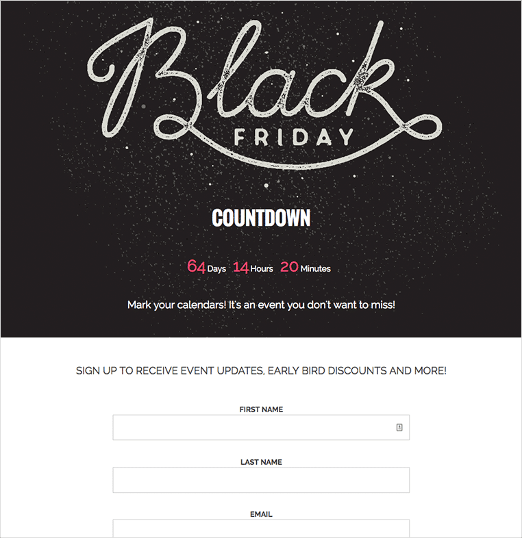 Black Friday is an event. Some shoppers prepare their lists well in advance. Create a countdown campaign where folks can submit their email addresses to be the first to know about your Black Friday sales. Plus, tease products and services that you will be offering discounts on come Black Friday.