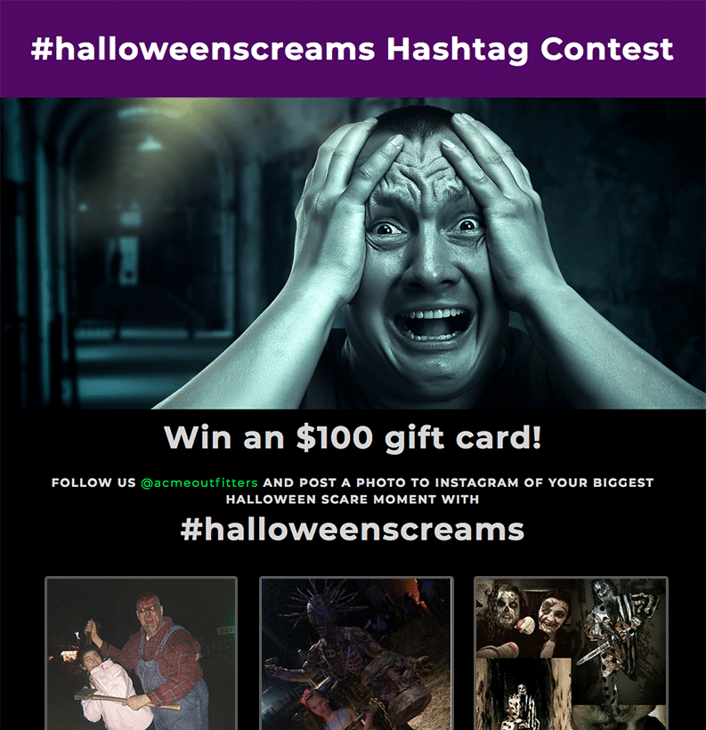 A hashtag contest is perfect for boosting engagement because they are so easy for folks to enter. For Halloween, try a contest where folks share their funny haunted house reactions, show off their costumes, or post their yard decorations. Just come up with a hashtag, then encourage people to enter your contest by posting their photos to Instagram or Twitter. It’s that simple.