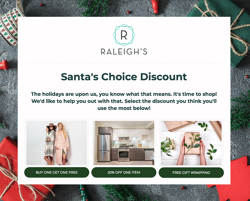 Multi-day giveaways are Christmastime classics. During December, folks are full of anticipation for the gifts they will find under the tree on Christmas Day. A multi-day giveaway calendar is a fun way to leverage this excitement, as a new prize is revealed each day. Folks must return to the campaign every day to submit an entry, which not only builds your list of leads, but also increases engagement.