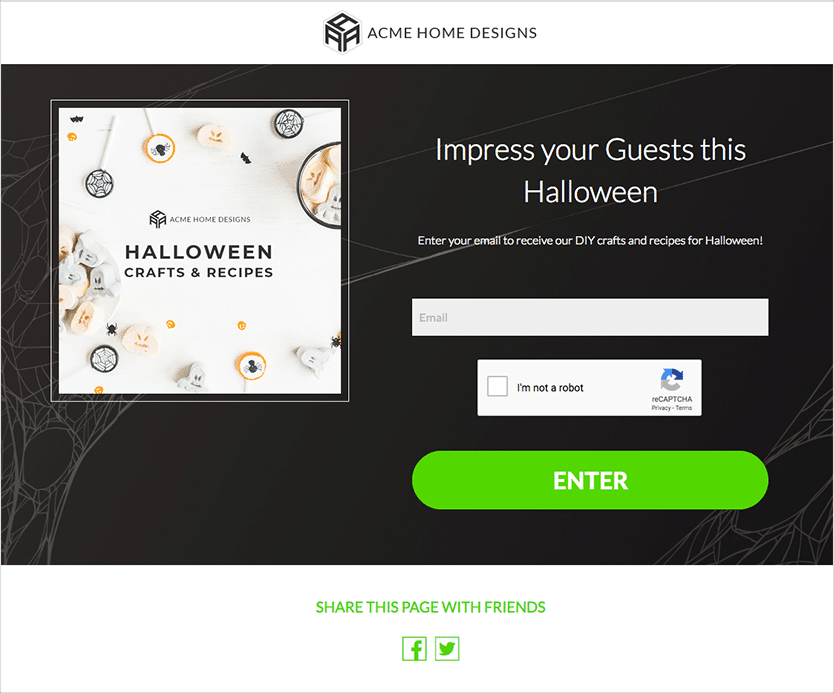Create a personality quiz where people must answer questions about themselves in order to find out the “type of Halloween candy they are.” To reveal the answer, the quiz taker must submit their name and email address. This doesn’t need to be a candy-related quiz. You could help folks choose their Halloween costume, give them recommendations for Halloween movies, or reveal their level of “scaredy cat” all based on their answers to various quiz questions.