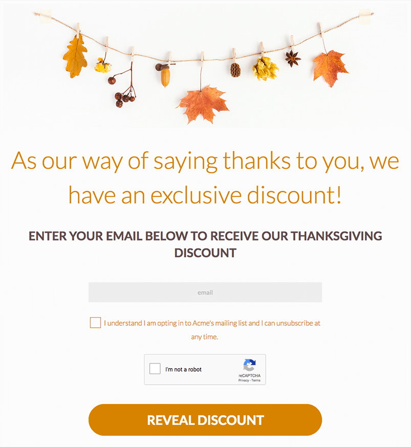 Before Thanksgiving, give folks the chance to sign up and receive their discount via email. Then, schedule an email to send at the same time the discount becomes available on your campaign.