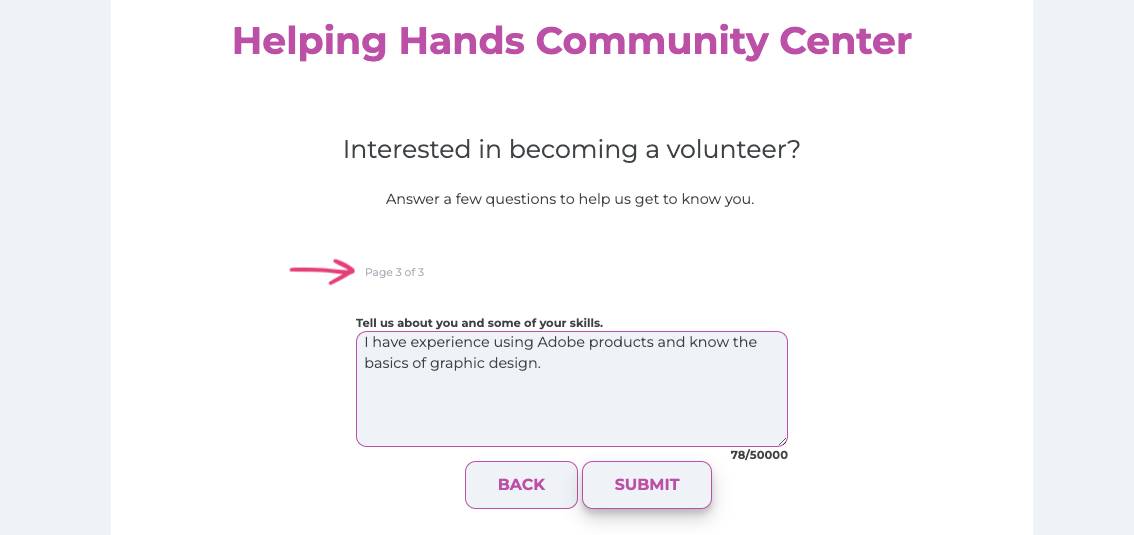As the name implies, a multi-page form asks questions across multiple pages. Often, the viewer only sees one question or a few questions per page.