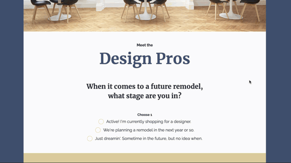 Beyond field consolidation, branching logic allows you to prioritize your list of collected leads by type. In the example above, the design business can use the data collected to see who is ready for a remodel and who can be placed in a remarketing cycle for a remodel down the road.