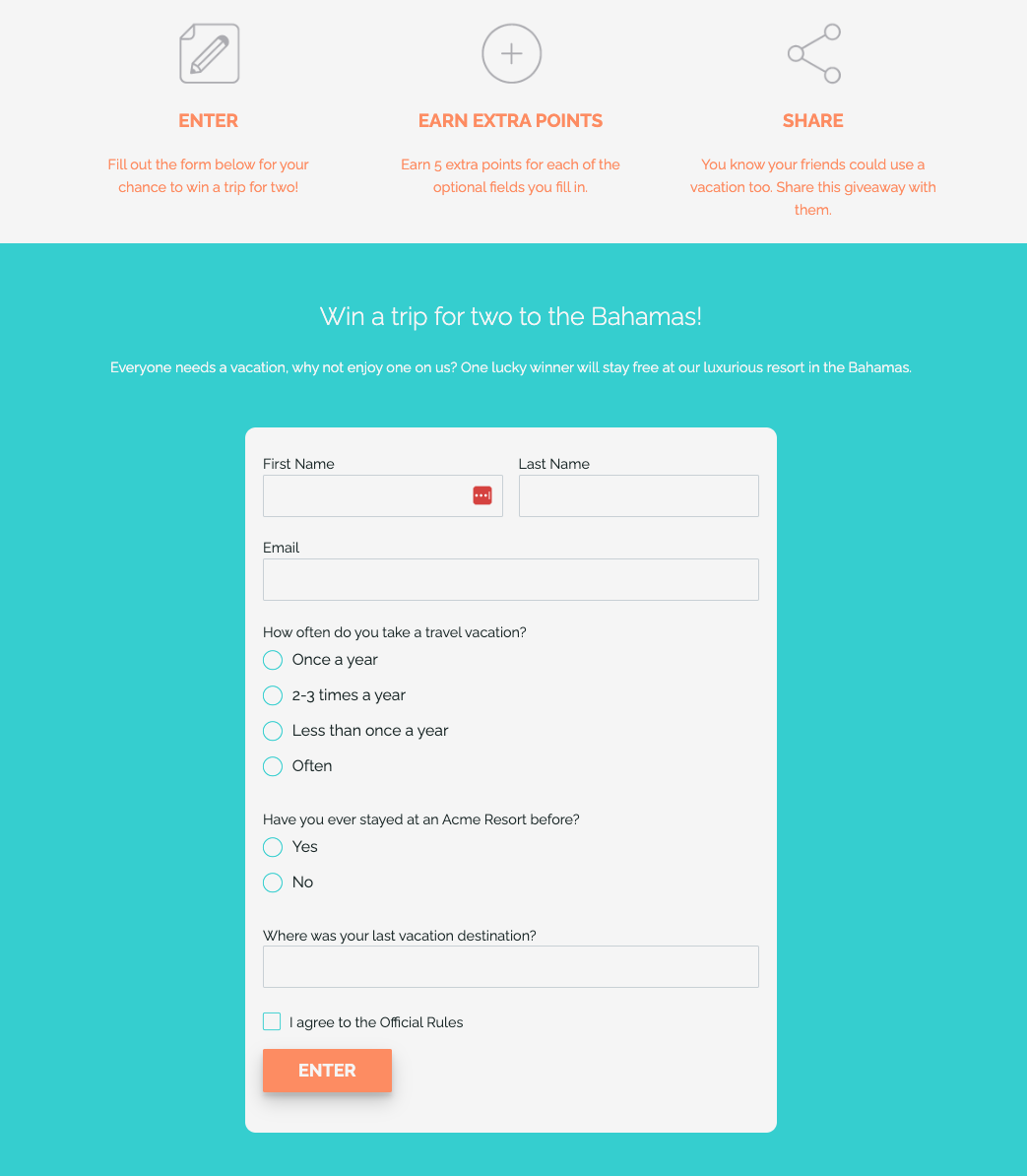 In another ShortStack-built example, the giveaway offers up to ten extra chances to win in exchange for a bit of information about the participant’s travel habits. Questions like these can go a long way in helping a business remarket to its customers or perhaps develop a new marketing strategy altogether.