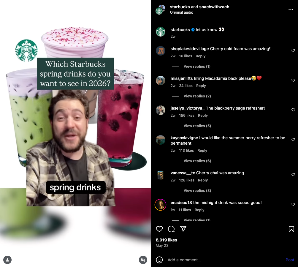 As a popular example, Starbucks has used polls to steer their seasonal drink offerings e.g., “Pumpkin Spice or Peppermint Mocha?”. Not only does this generate buzz around limited-time offerings, but it also helps drive sales because it provides instant feedback for product planning.