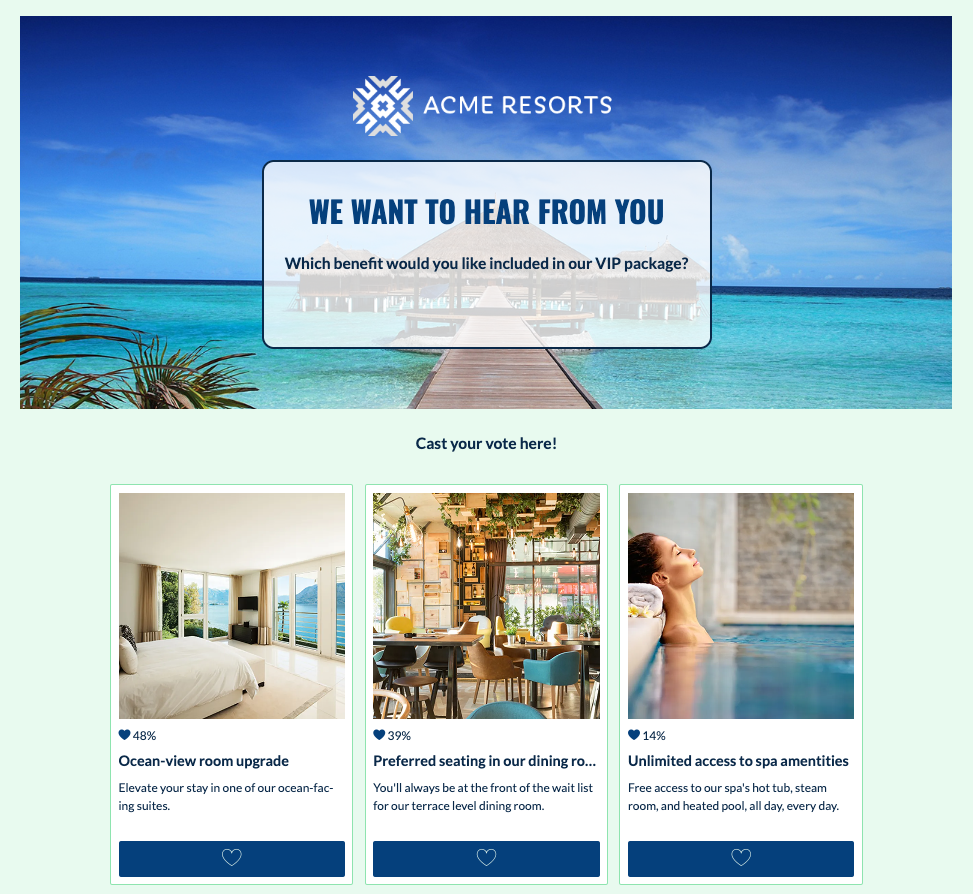 For example, this poll is being used to make improvements to a resort’s VIP packages. Poll participants are improving their experience by voting for the customer benefits they would like to see while the resort is gathering valuable insight into the perks that are most valuable to their customers–this can be invaluable for future marketing.